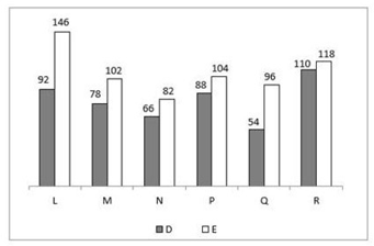 The bar graph given below shows the number of players participating in two games in six different schools. L,M,N,P,Q and R.