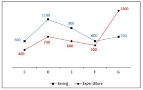 The line chart given below shows the saving and expenditure of 5 companies C,D,E,F and G.
