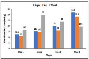 The following bar graph shows the distribution (in kg) of Sugar, Wheat and Suji, sold by four shops 1,2,3 and 4, on 1st September 2021.