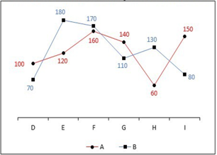 The line chart given below shows the marks obtained by two students A and B in 6 subjects.