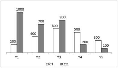 The bar graph given below shows the sales of two companies C1 and C2 in 5 years.