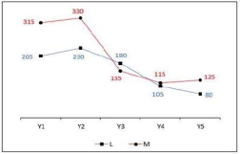 The line chart given below shows the GDP of two countries L and M in five different years.