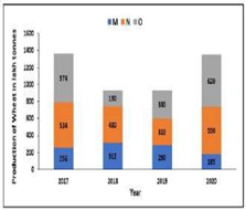 The graph shows the production of wheat (in lakh tons) by states M, N, and O in four consecutive years. Find the year which has the minimum production of wheat.