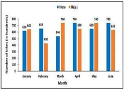 The below bar graph shows the number of bikes (in hundreds) sold by Hero and Bajaj over the first six months of 2022.