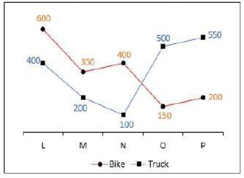 The line chart given below shows the production of bike and truck by five companies L, M, N, O and P.