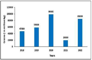 The following bar chart shows the quantity (in million kg) of grains exported by India from 2018-2022. By how much percentage is the minimum export less than the average export in the given peiod?