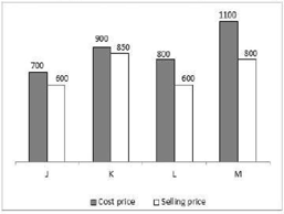 The bar graph given below shows the cost price and selling price of four articles J, K, L and M.