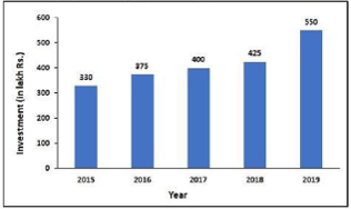 The following bar graph shows the amount (in lakh Rs.) investment by a company in purchasing raw materials over the years 2015 to 2019.