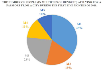 The number of people applying for a passport from a city was monitored, and it was found that the numbers (in multiples of hundred) during the first five months of 2019 were as follows: January (M1)-248, February (M2)-134, March (M3)-162, April (M4)-94, May (M5)-72. These have been represented through the given pie chart.
