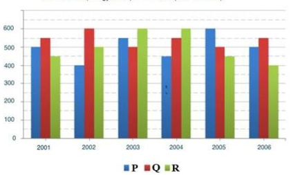 A company produced a new energy drink of three different flavours - P, Q and R - for athletes. The production of the three flavours over a period of six years from 2001 to 2006 has been expressed in the bar graph shown below.Study the graph and answer the question that follows.