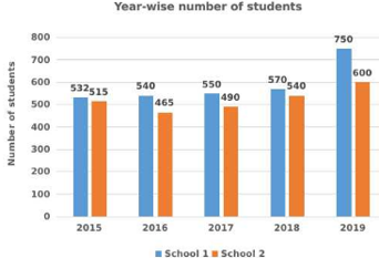 The year-wise student enrollment of two schools over a period of 5 years has been presented in the following bar graph.