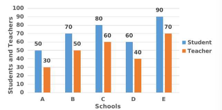 The number of teachers and students in five school A, B, C, D and E in a city has been depicted through the given bar graph, where the number of students has been presented as multiples of ten.Study the bar graph and answer the question that follows.
