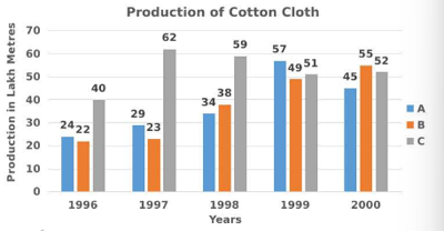 The following graph shows the production of cotton cloth (in lakh metres) by three companies A, B and C over the years.