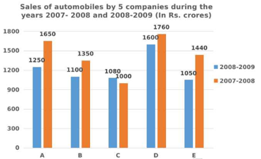 The given bar graph represents the sales of automobiles (in ₹ crores) by five companies A, B, C, D and E in the years 2007- 2008 and 2008-2009.