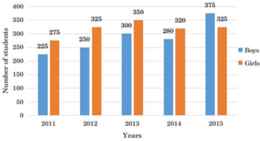 The total number of girls who appeared in 2012, 2013 and 2015 is what percentage less than the total number of boys who appeared in all the five years (correct to one decimal place)?