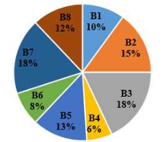 If the total number of cars sold of these 8 brands taken together during the given year is 2800, then what is the difference between the numbers of cars sold of B2 and of B6?