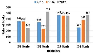 The following bar graph shows the number of books sold from four different branches, B1, B2, B3 and B4, of a publishing house, in three consecutive years.