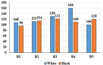 The following bar chart shows the numbers of white and black cars sold of 5 different brands in a city during a given year.
