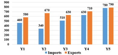 What is the positive difference in the total export figures of all the five years taken together and the total import figures of all the five years taken together?
