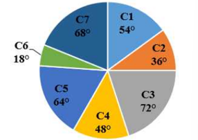 The following pie chart shows the sectors representing the shares of the number of electric buses manufactured in each of 7 different colours in a given year in terms of the central angles (in degrees) with respect to the total number of buses manufactured during that year of all the 7 colours taken together.