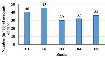 The following bar chart shows the number of accounts (in '00) opened in a month by 5 banks.