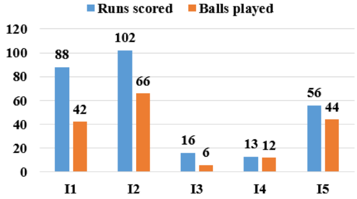 The following bar chart shows the runs scored and the balls played by a batsman in 5 different inning.