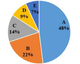 The given pie chart represents the distribution of the percentage of sales of a particular brand of bike from five showrooms. A, B, C, D and E, during 2021. The total number of bikes sold during that year from the five showrooms is 6000.