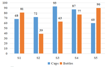 The bar-graph shows the number of bottles and the number of cups sold by five different shops during a given week.