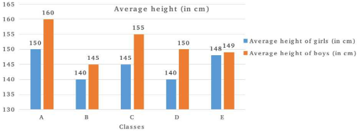 Study the given graph and answer the question that follows. The graph shows the average height (in cm) of the boys and the girls of five classes in a school.