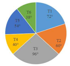 The pie chart given below gives the measures of the central angles of the sectors that reflect the number of flats in 6 different towers in a housing society with respect to the total flats in these 6 towers taken together.