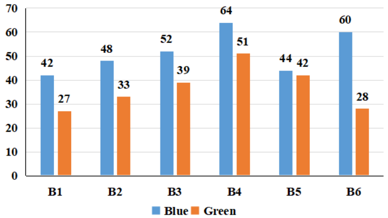The bar-graph shows the sales of six different brands of blue and green pens in a town on a given day.