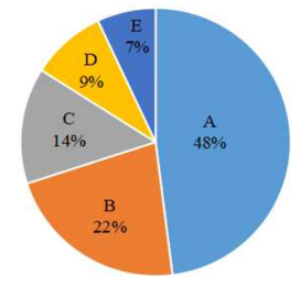 The given pie chart represents the distribution of the percentage of sales of a particular brand of a bike from five showrooms. A, B, C, D and E during 2021.