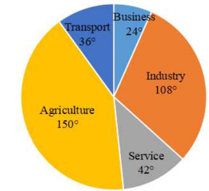 As per the information provided above, how many more people work in the service sector when compared to the number of people who engage themselves in business?