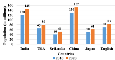 Study the given bar-graph and answer the question that follows. The bar-graph shows the population of six countries (in millions) in 2010 and 2020.
