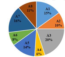The pie chart given below shows the number of pens sold by each of 8 different shops in a month as a percentage of the total number of pens sold by these 8 shops taken together in that month.