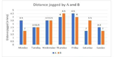 The following graph refers to the distance jogged daily by two persons A and B. If 100 calories are burnt by jogging 1km, what is the difference between the calories burnt by A and B in the given week?