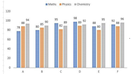 The bar-graph given below shows the average marks scored by six students (A, B, C, D, E and F) in Mathematics, Physics and Chemistry. The maximum marks of each subject is 100.