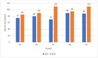 The given bar graph shows the sale of toys (in thousands) from five branches of a manufacturer for two consecutive years, 2021 and 2022.