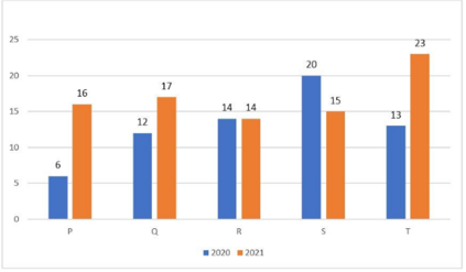 The following graph represents the production of electric scooters (in thousands) for the years 2020 and 2021 from five manufacturers P, Q, R, S, and T.