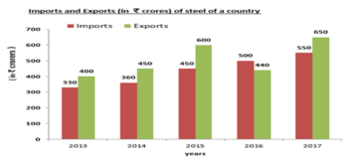 The given bar graph shows the imports and exports (in ₹ crores) of steel of a country during the years 2013 to 2017.