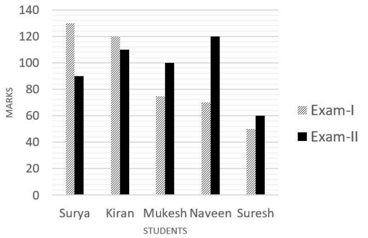 The given bar graph shows the marks obtained by five students in Exam I and Exam II. Study the bar graph carefully to answer the question that follows.